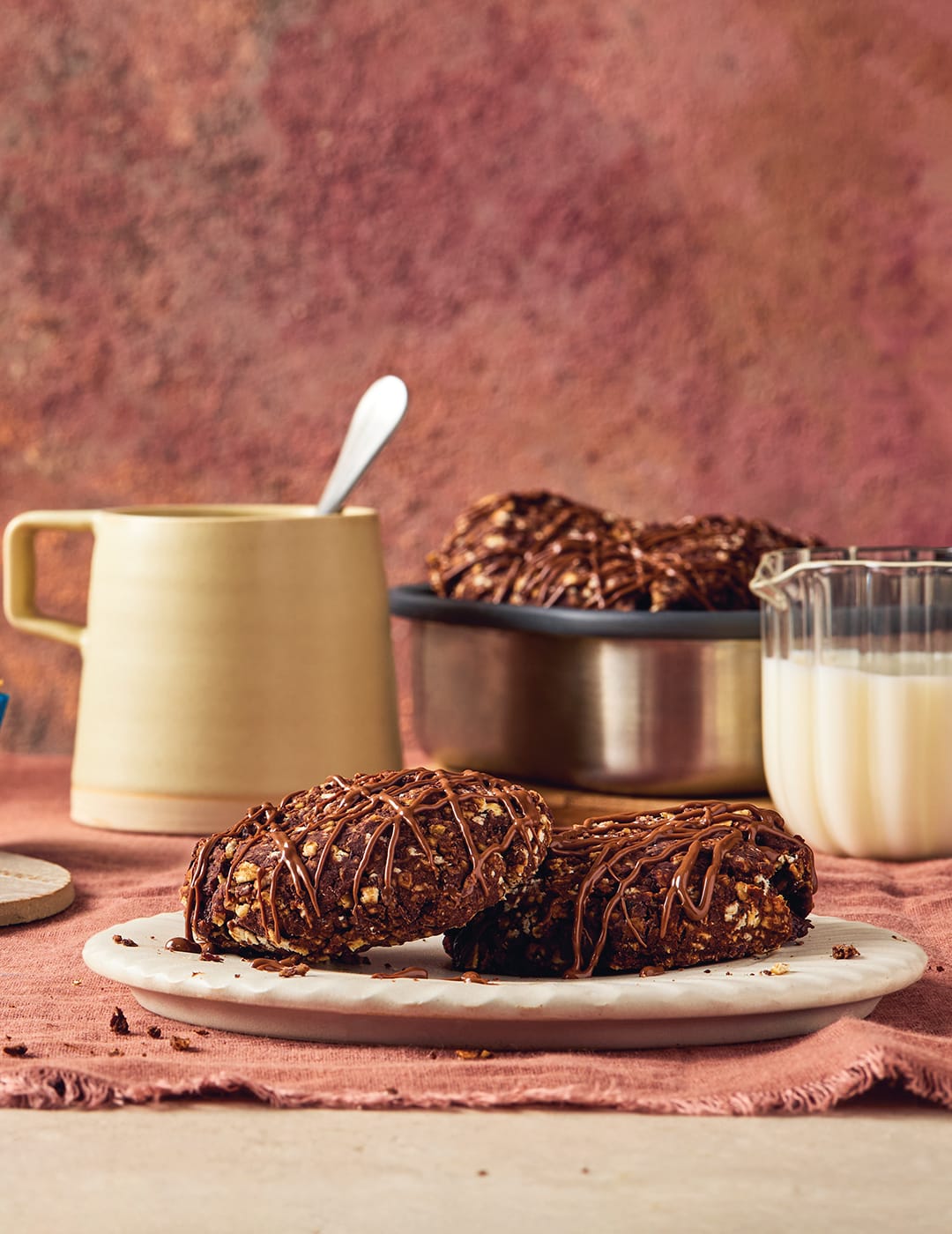 3 Scoop the mix into a mixing bowl, and stir through the other half of the oats and the chocolate chips.
