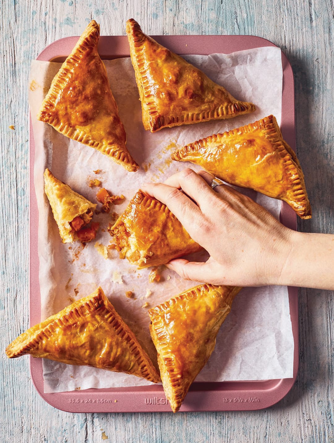 3 Unroll the pastry and cut it into 6 equal squares. Brush the edge of each square with the egg wash. Add a generous tablespoon of the filling to each square, then fold the pastry over to make a triangle, sealing the edge with a fork. Brush the pies with the egg wash.