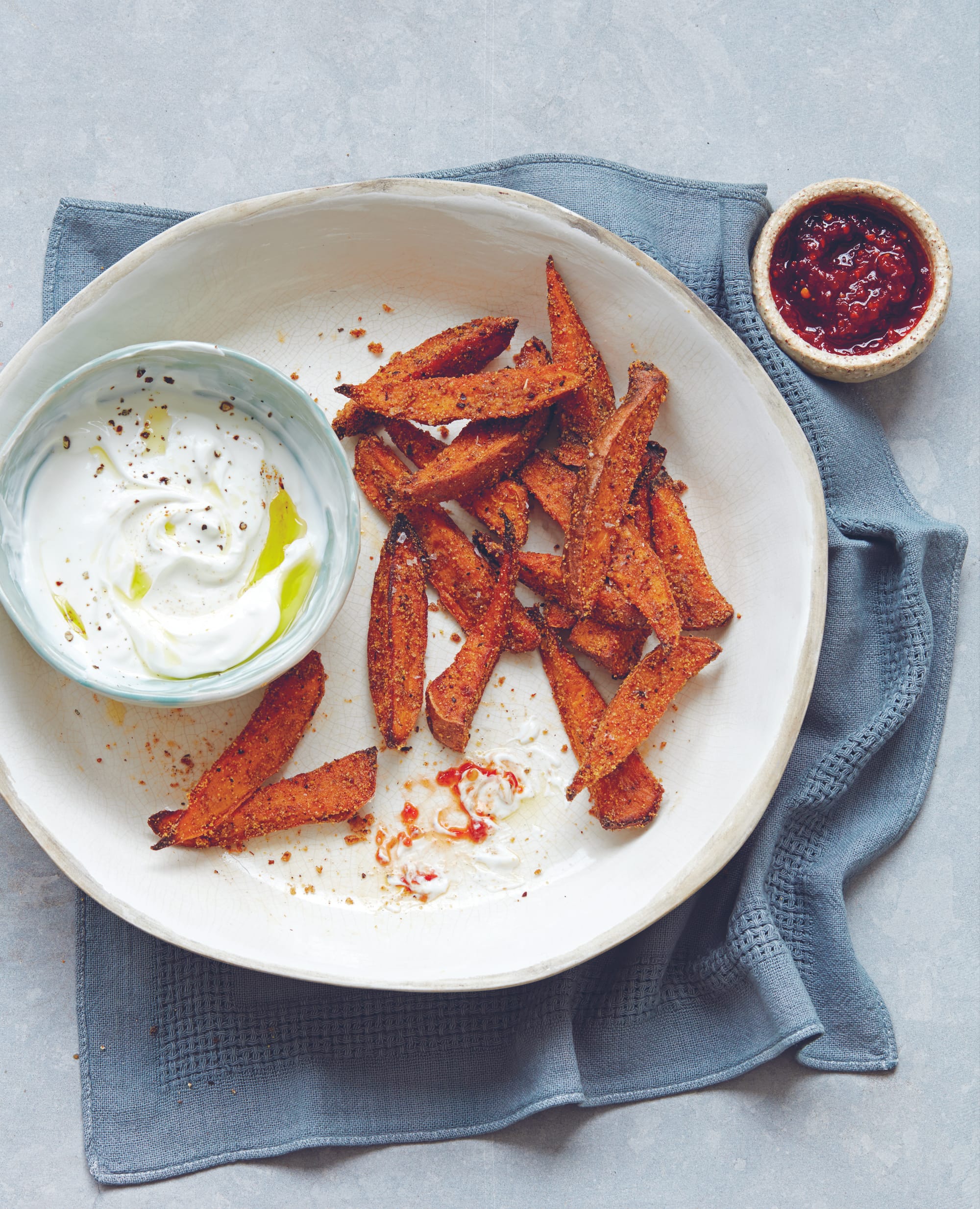 5 Serve the sweet potato wedges warm with garlic yogurt dip and hot sauce or sweet chilli sauce, if desired.