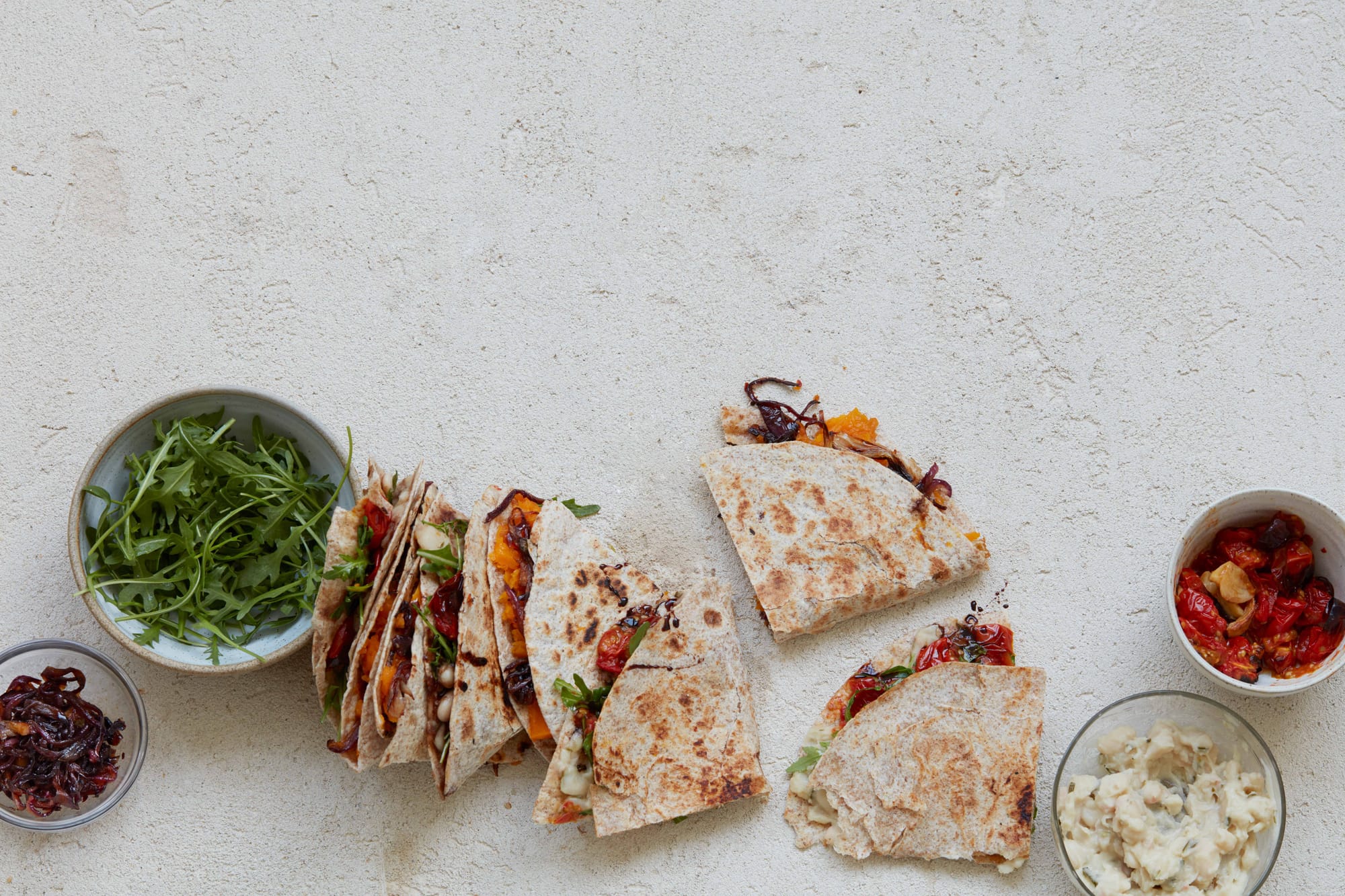 8 For the white bean and balsamic filling, spread a couple of heaped spoonfuls of beans onto one half of the wrap, top with roasted tomatoes, rocket/arugula and a little syrupy balsamic.